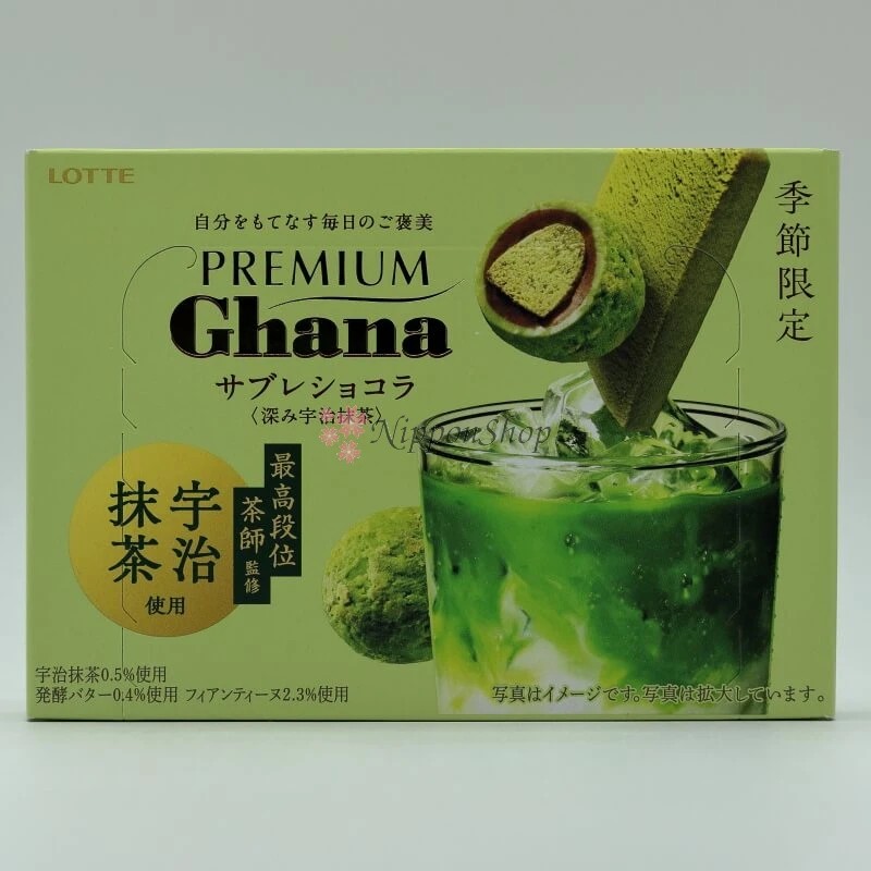 Premium-Ghana-Sable-Chocolates mit feinstem Uji Matcha, sowohl im Kekskern als auch in der äußeren Hülle. Dazwischen eine leckere Milchschokolade.