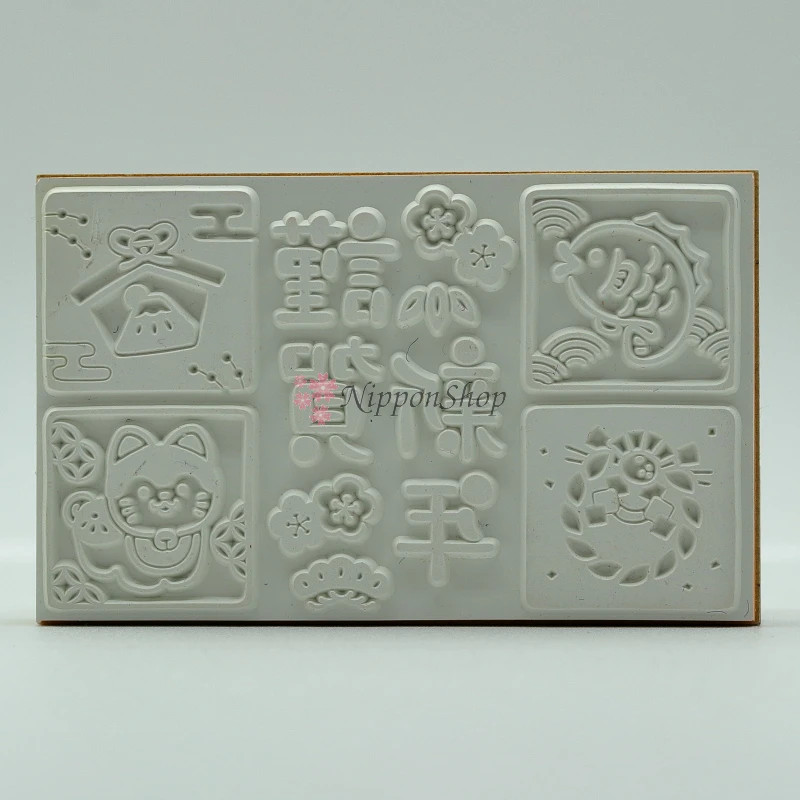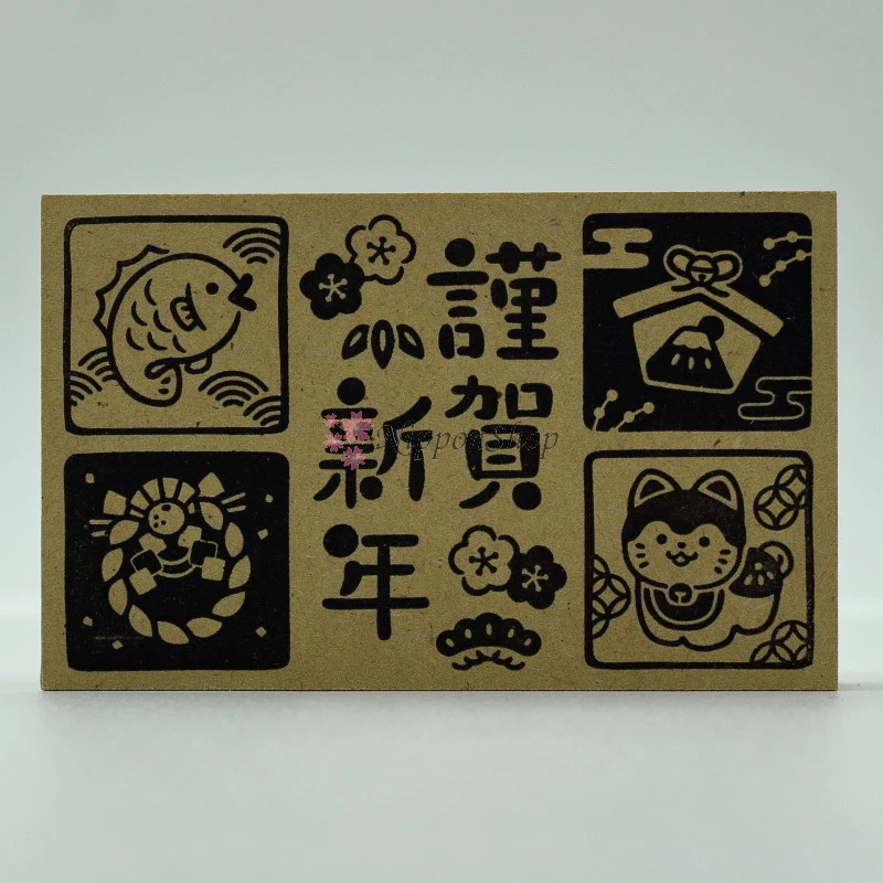 Stempel mit japanischem Neujahrsgruß und typisch japanischen Symbolen mit Neujahrsbezug.