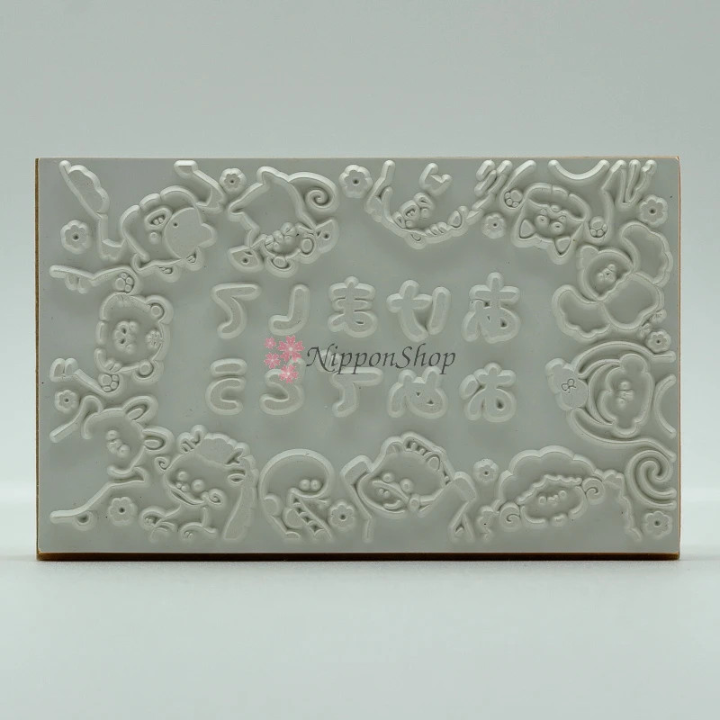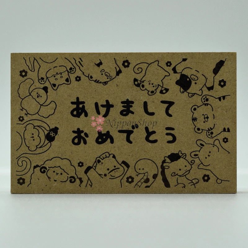 Stempel mit japanischem Neujahrsgruß umgeben von niedlichen Illustrationen der 12 Tierkreiszeichen.