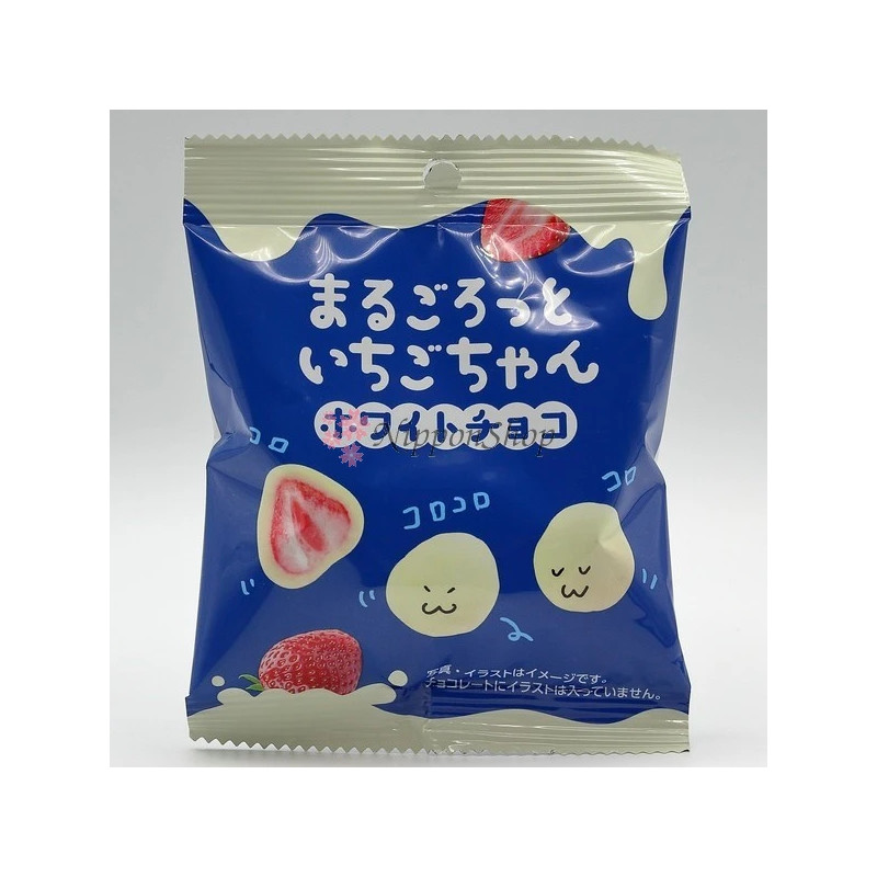Gefriergetrocknete Erdbeeren (ganze) in einer Hülle aus feiner weißer Schokolade.