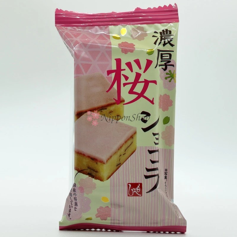 Delicious chocolate snack in "Gateau Chocola" style with sakura flavour. A sweet cherry blossom cream as a top layer and real sakura leaves inside complete the truly springtime treat.