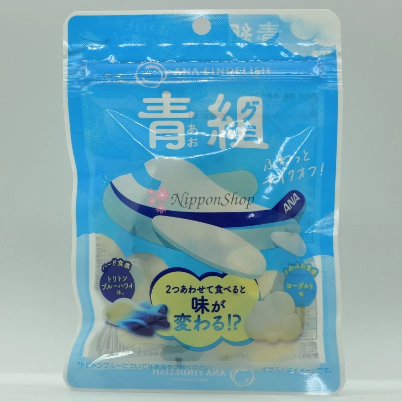 A selection of two different gummies. Aeroplanes with a "Triton Blue Hawaii" flavour and a firm consistency, and clouds with a yoghurt flavour and a soft consistency.