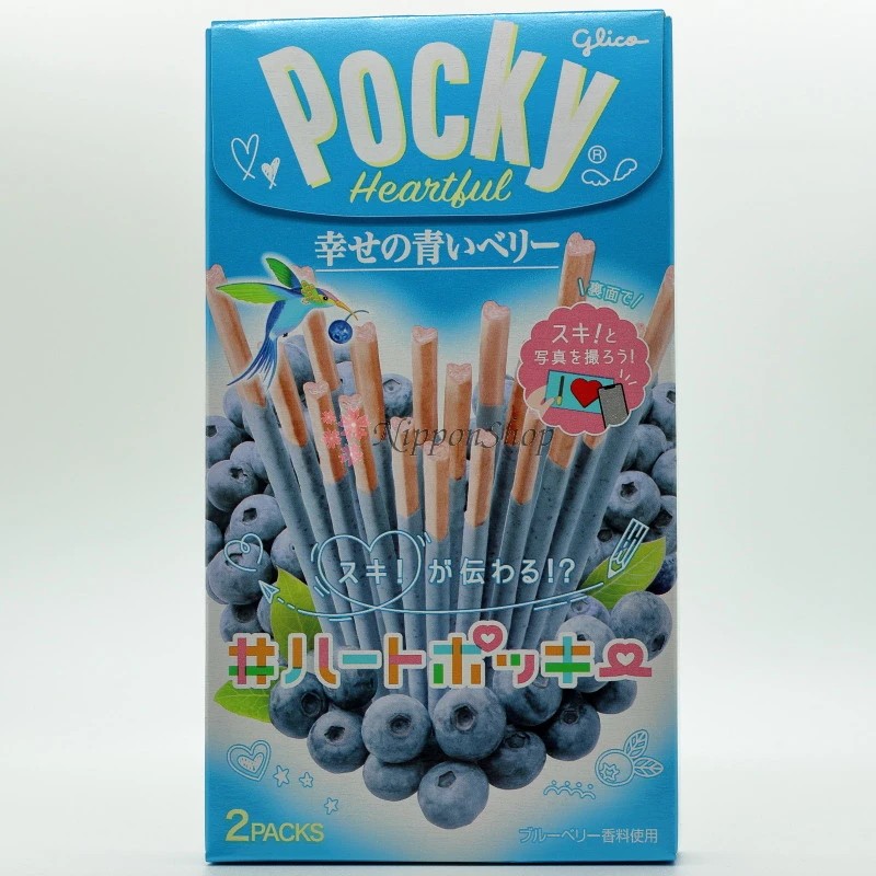 The heartful edition of Pocky with heart shaped cookie sticks, covered with a fruity blueberry flavoured chocolate.