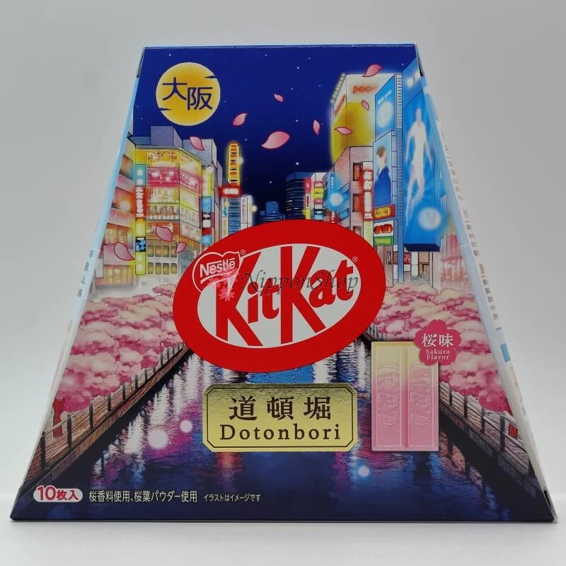 KitKat Special Edition Osaka Castle with Sakura flavour in a very cute and decorative present packaging. One side shows modern Osaka with cherry blossoms and the other traditional Japan with the famous Osaka castle.